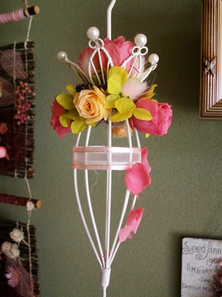 カーネーション、ミリオングラスを園芸用の白いお皿にさしワイヤーにリボンを巻きハート型を作りさして長目のリボンをアクセントにつけました。シックな感じにし上がりました。