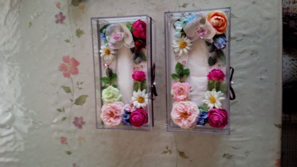 ティシュボックスに何種類のアーティフイシャルフラワーをグーグルで配置良く付けます。