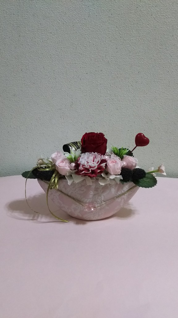 花はプラザーブドのローズ(カブキ)とローズ(ビビアン)ライスフラワー、手前にソーラーカーネーションをさしましたとてもおしゃれにし上がりました。